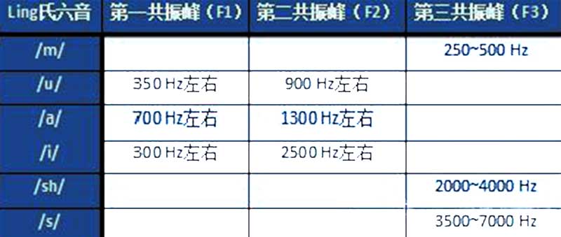 若按照频率从低到高排序为:/m/、/u/、/ɑ/、/i/、/sh/、/s/。其中,/m/、/u/是低频音,/ɑ/、/i/是中频音,/sh/、/s/是高频音。注意:在这里/m/不要发成/mo/音,/mo/音频率高,发成/mo/检测不到对低频反应。/sh/、/s/要发成清音,声带不能振动,声带振动了频率会降低。