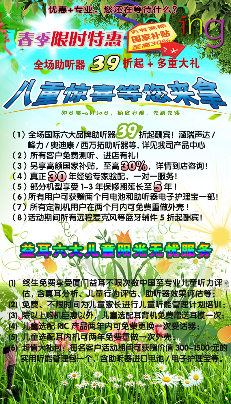 促销期间,所有在我司凡14岁(含)及以下年龄的少年儿童选配单台助听器,可享受如下六大益耳无忧儿童阳光贴心服务: