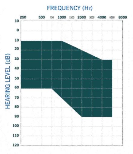 “验配范围图表”通常是助听器厂家在产品规格书(Data Sheet)中提供的一张图表,它看起来和您的听力图有点相像。横坐标 (X轴) 代表频率 (Hz),从左到右,声音从低沉的到尖锐。纵坐标 (Y轴) 代表响度 (dB HL),从上到下,声音从安静到响亮。