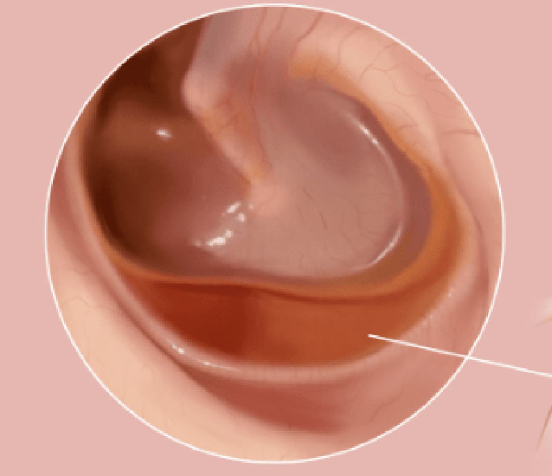 (3)鼓室积液:鼓膜呈粉红色或黄色、淡黄色油亮,透过鼓膜可看到液平面,此液面呈一头发丝状弧形线,称发线,当头位变动时此液平面保持水平位,有时可见到液体中的气泡。